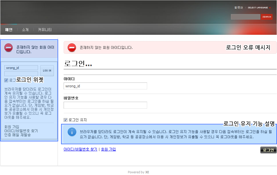 - 로그인 위젯을 포함 할 경우 반드시 로그인 실패 메시지 노출 영역 그림 01-04 도 디자인합니다.