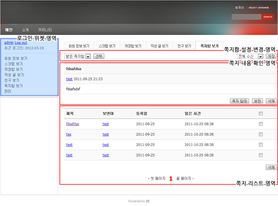 - 쪽지함 설정 변경 영역, 내용 확인 영역과, 리스트 영역을 구분하여 디자인 하되 필수로 포함합니다.