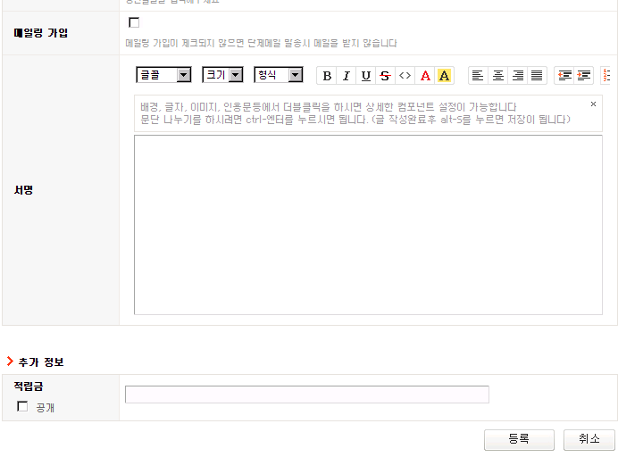 관리자페이지>가입폼관리>생성하여 아래와같이 추가정보를 생성했습니다. 그런데 회원님들께서 신규가입페이지와 회원정보수정