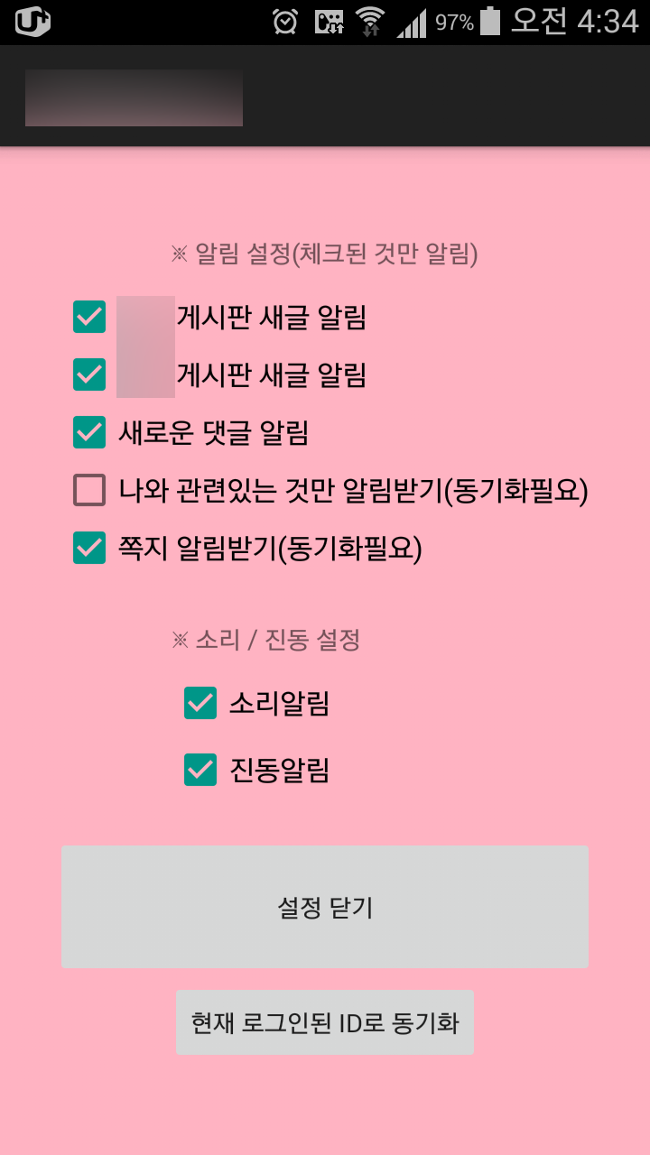 단 자신이 쓴 글의 댓글이나 새댓글이 달렸을 경우에만 알림이 되도록 하려면 로그인 한 후 설정 화면에서 회원 동기화 버튼을 누르셔야 합니다.