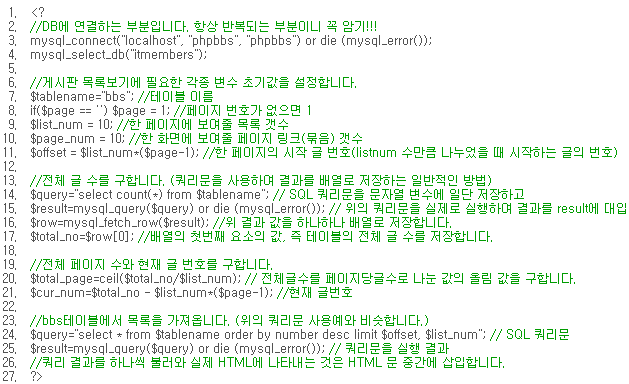 오늘 다룰 1~27행은 mysql DB에 연결하는 부분과, 프로그램에 필요한 변수를 설정하는 부분, 그리고 bbs 테이블에서 목록을 뽑아내기 위해 sql 쿼리를 날리고(?) 그 결과를 변수에 저장하는 부분 등으로 구성되어 있습니다.