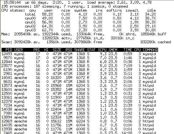 램 업그레이드 한 이유 중의 하나는, 서버를 개인적으로 운영하면서 느낀 것은 적은 양의 메모리가 있을 때, 그 메모리가 가지고 apache, mysql 등 서버 튜닝에 엄청 신경 쓰는 방법이 있고, 얼마 비싸지도 않은 램을 확 충분히 늘려서 apache, mysql 서버 튜닝을 쉽게 하는 방법이 있다. 많은 경험과 실제 테스트 없이는 효율적인 튜닝하기 힘들다는 것을 피부로 느끼고 ^^; 나는 후자 방법을 택했다.
