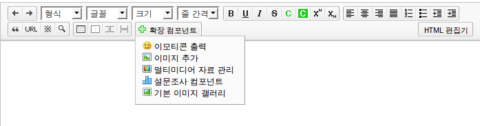 에디터의 기본적인 기능 외 설문조사 컴포넌트와 같이 XE의 모듈을 이용하여 만들 수도 있고, 지도, 책 등 OpenAPI를 이용하는 컴포넌트를 만들 수 있습니다. 또한 javascript를 추가하여 동적인 모션을 추가하여 이미지 겔러리 등도 만들 수 있습니다.
