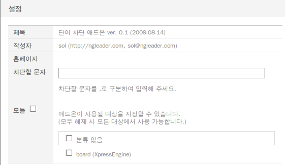 block_word 애드온의 경우 관리자가 차단할 단어를 등록해야 합니다. 그래서 <extra_vars> 부분에