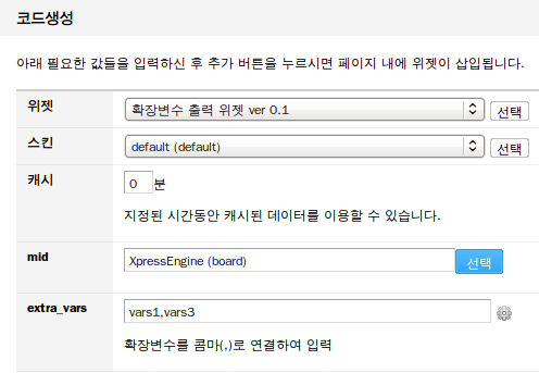 위 화면과 같이 추가로 받아야 할 할목은 게시판을 선택하는 mid와 확장변수를 받는 부분이 필요합니다. 그래서 <extra_vars> 부분에 타입이 mid인 selected_module_srl 과 타입이 text인 extra_vars_list를 입력하면 화면과 같은 폼이 생성됩니다.