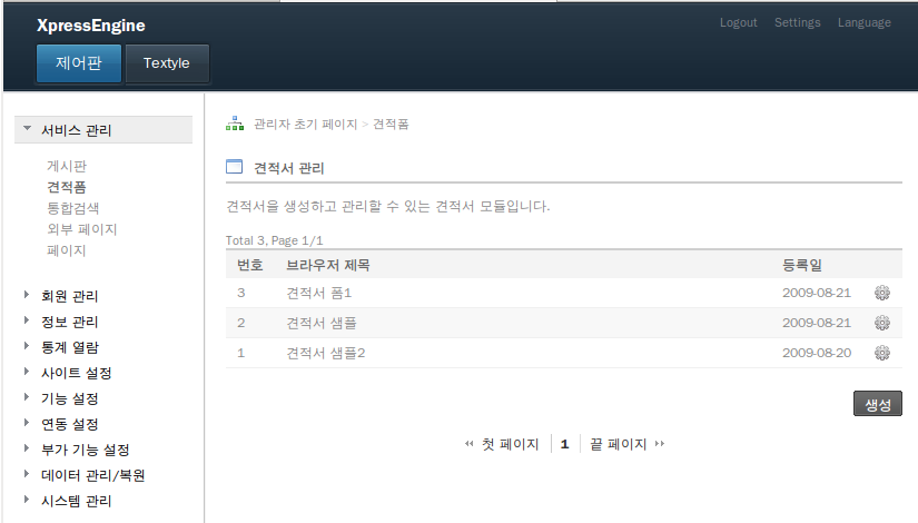 구현할 견적서 모듈의 관리자 견적서폼 목록입니다.