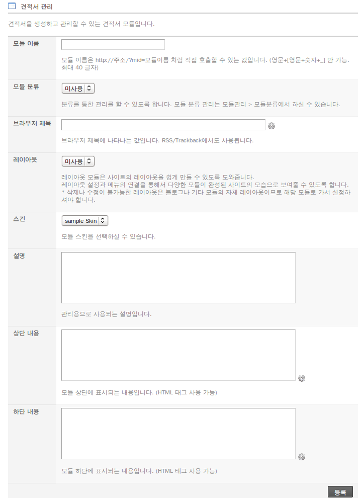 견적서폼을 등록하는 관리자 화면입니다. 게시판으로 보면 게시판을 생성하는 부분입니다. 견적서 폼을 추가하면 module 컨트롤러에서 모듈을 추가 합니다. 실제 DB의 xe_modules table 등에 등록을 하여 mid및 module_srl을 생성합니다.